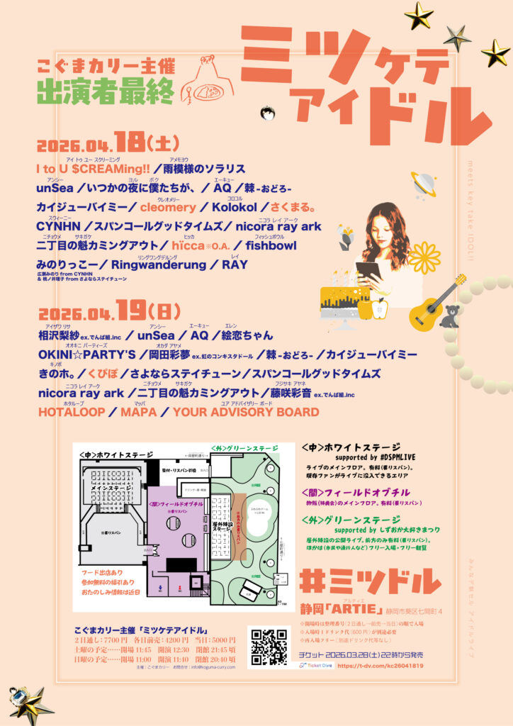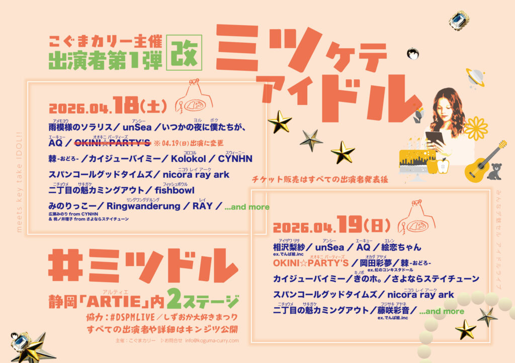 開催日 2026年04月19日 OPEN 11:00 START 11:40 開催場所 静岡「ARTIE」内2ステージ チケット https://ticketdive.com/event/kc26041819 - 2026年04月25日